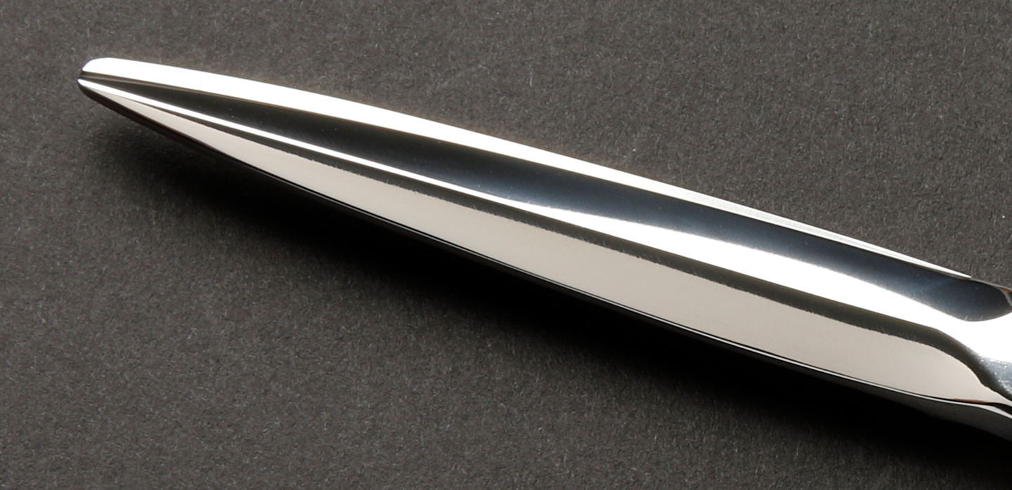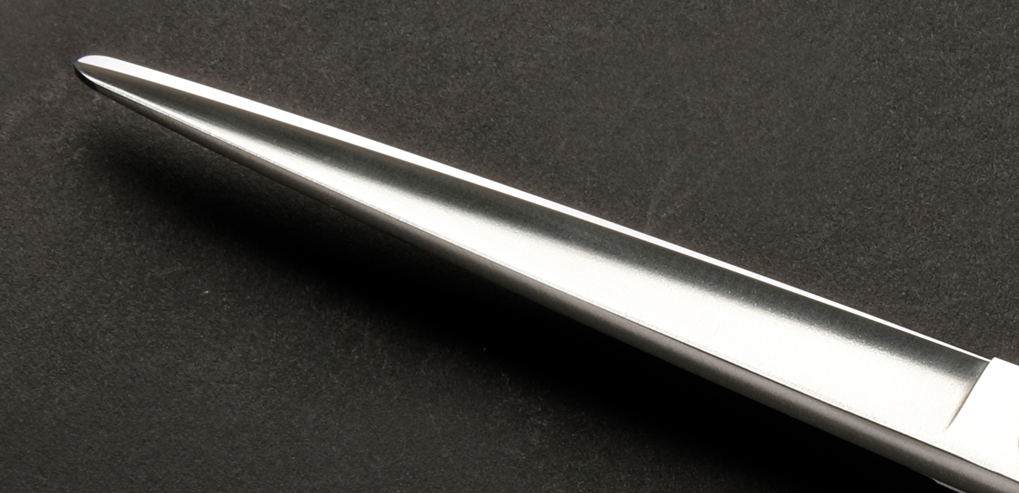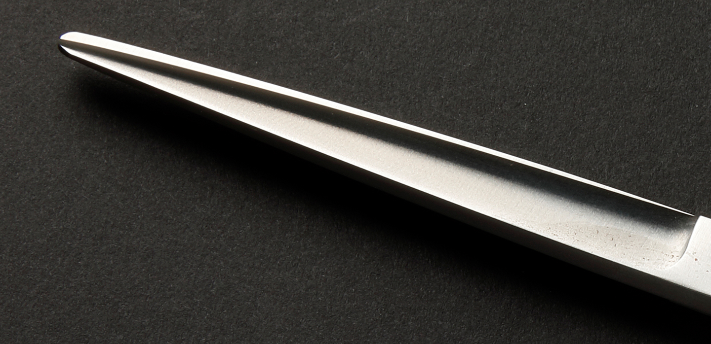 刃物の4大条件である、腐食耐性、硬度、靱性、耐摩耗性に著しく優れており、特に材質が固く(硬度63)微細な組織が特徴で、コバルト合金鋼などと比較してもさらに長期間切れ味を保つことができます。現在のシザー用の素材としては最高ランクの素材です。
