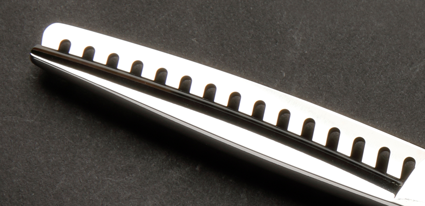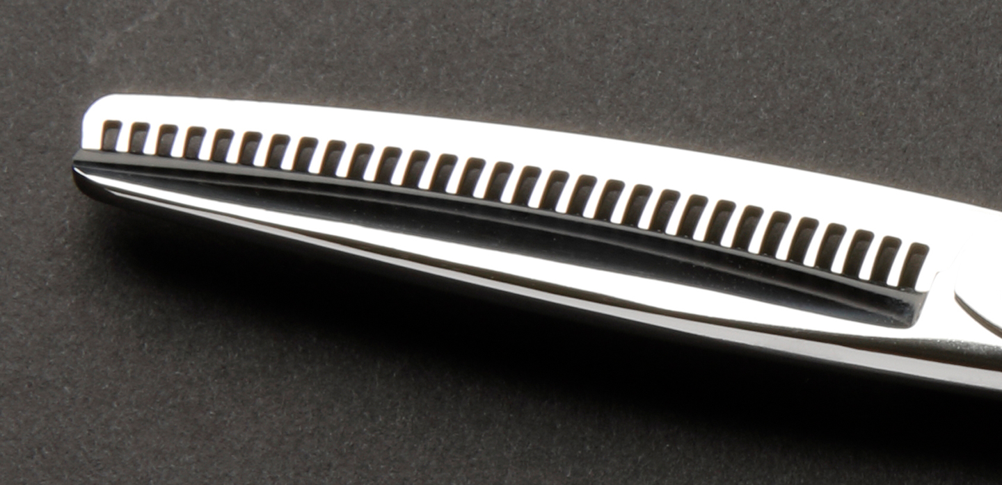 両クシ刃を用いることで、これまでの棒刃による引っ掛かりのストレスを一切無くすことを実現。クシ刃に5段刃特殊エッジ加工を採用することで的確に髪を捉えスムーズかつスピーディーな施術を可能にした、従来のカットシザー・セニングシザーにはない全く新しい感覚で幅広いカットデザインを作ることができます。