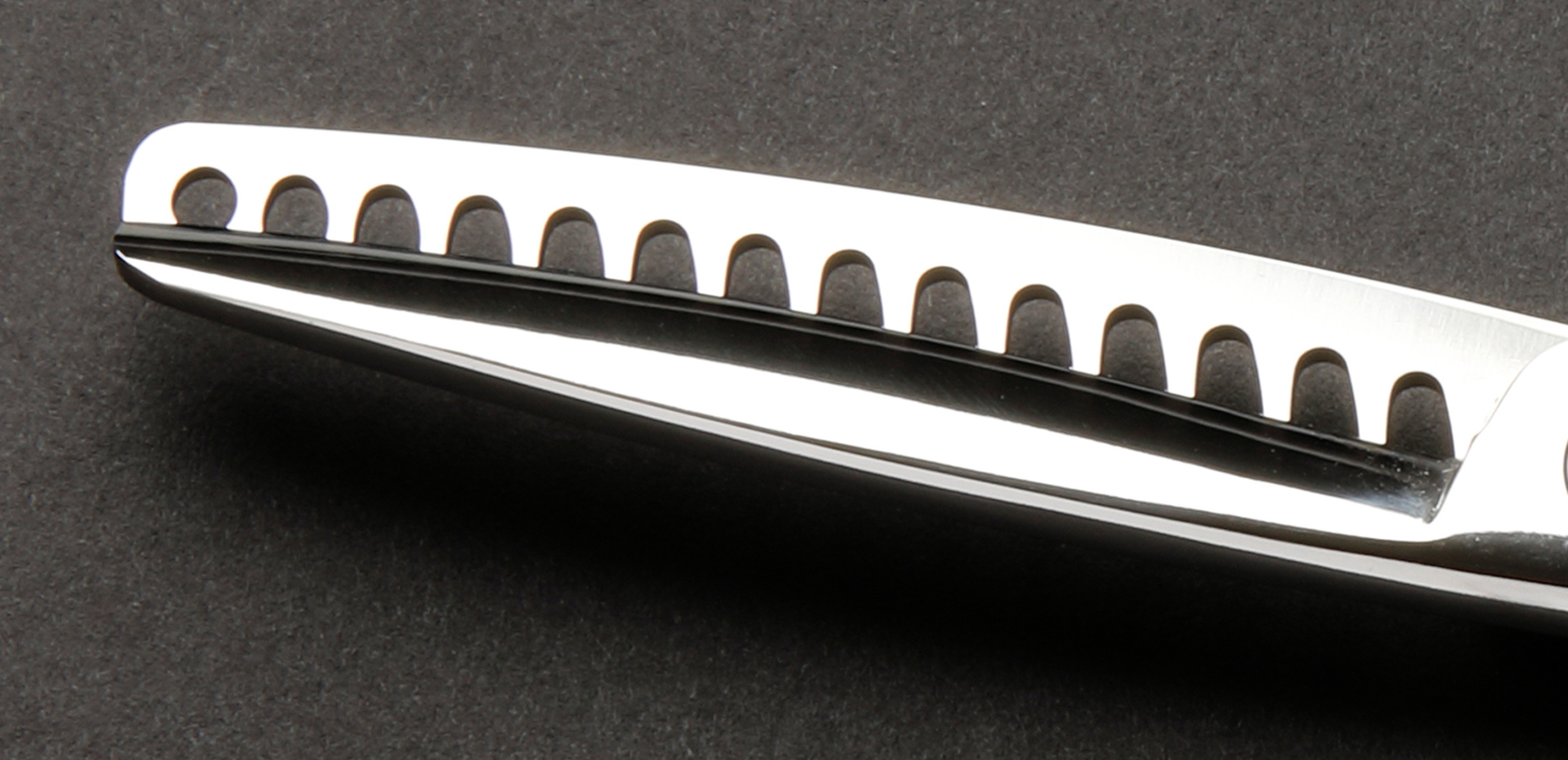 両クシ刃を用いることで、これまでの棒刃による引っ掛かりのストレスを一切無くすことを実現。クシ刃に5段刃特殊エッジ加工を採用することで的確に髪を捉えスムーズかつスピーディーな施術を可能にした、従来のカットシザー・セニングシザーにはない全く新しい感覚で幅広いカットデザインを作ることができます。